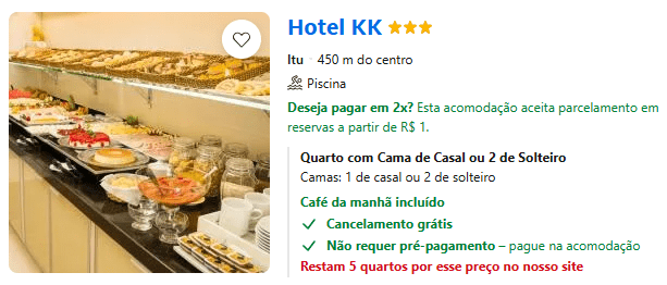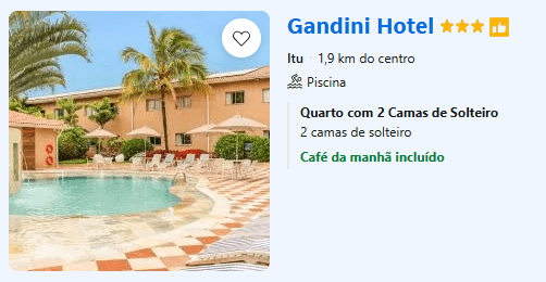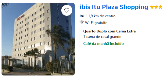 Selecionamos alguns hotéis na cidade de Itu para facilitar a hospedagem de vocês. Além disso, fechamos uma parceria com o Ibis, onde você ganha check-in mais cedo e checkout tardio!